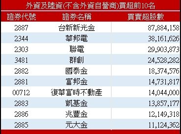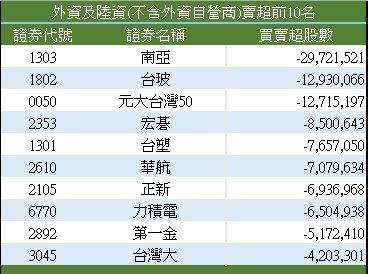 統計外資買超前十名個股中,竟有6檔金融股,買超台新新光金最多,另外,電子股有3檔,華邦電(2344)居外資買超第二名,外資單日買超38,162張,聯電(2303)及群創(3481)也是外資買超標的;不過,南亞及台玻(1802)則分居外資賣超前兩名,外資單日賣超南亞29,722張,賣超台玻12,930張。