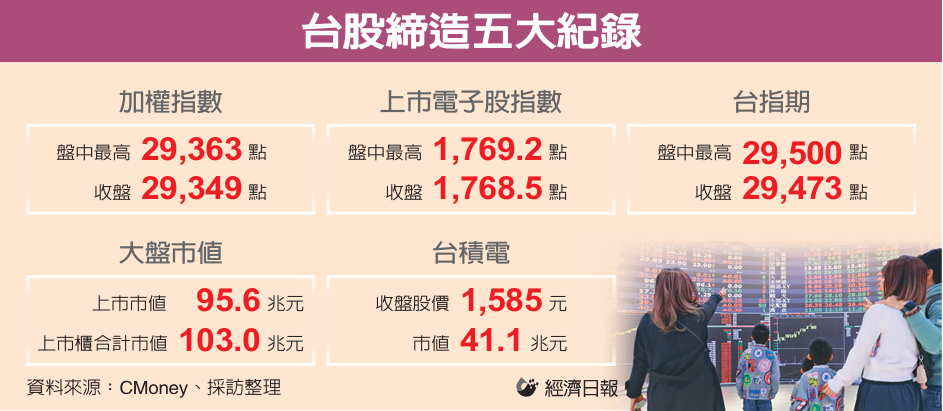 台股昨日改写五大新纪录,首先,加权指数盘中最高29,363点、收29,349点,持续创高。其次,上市电子股指数盘中攻至1,769.2点、收1,768.5点,改写历史新高。第三,台指期盘中最高涨至29,500点、收29,473点,缔造历史新猷。第四,集中市场市值续增至95.6兆元、上市柜合计市值103兆元,续写历史高点。第五,台积电股价收1,585元、市值41.1兆元,连日打破新纪录。