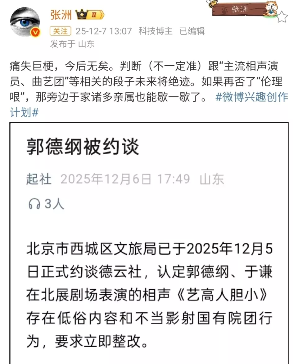 据悉,是北京西城区文化和旅游局近日对德云社进行了约谈,指出郭德纲、于谦在北展剧场表演的相声《艺高人胆小》存在低俗、不雅现象。