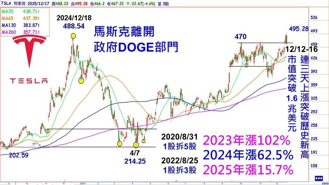 黄仁勋近日的辉达股价闷,由10月最高212美元跌破半年线到170美元,但最近马斯克又红了!Tesla总市值创新高突破1.6兆美元。2020年8/31一股拆五股,2022年8/25一股拆三股,他在2024年选举之前强力支持川普,股价大涨到12/18的488美元,但后来他和川普交恶,股价又狂跌到4月214美元,直到最近才靠Robotaxi发展到了新境界,又大涨上来,一年后的12/17冲到495美元,市值突破1.6兆美元。他喊出来的太空资料中心让市场为之一亮,带动了相关的类股大涨。