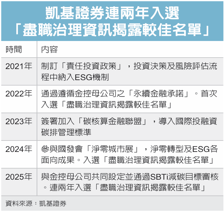在净零行动方面,凯基证券同时因应全球去碳化趋势,遵循金控「永续金融承诺」,签署加入「碳核算金融联盟」,导入国际投融资碳排管理标准,建构气候变迁风险管理机制,亦遵循SBTi(科学基础减碳目标)国际标准,以具体行动实践全资产净零碳排目标,并于2025年5月通过SBTi审核,足见积极落实碳管理措施,借此推动企业永续转型,加速实现净零排碳愿景。