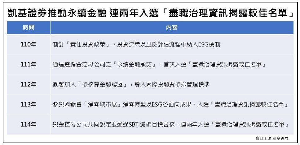 凯基证券为接轨国际责任投资原则,积极推动永续金融,自签署「机构投资人尽职治理守则遵循声明」后,迅速制订「责任投资政策」,将ESG纳入投资决策与风险评估流程,并透过关注被投资公司营运状况、出席股东会行使投票权及议合互动,落实尽职治理;在净零行动方面,凯基证券同时因应全球去碳化趋势,遵循金控「永续金融承诺」,签署加入「碳核算金融联盟」,导入国际投融资碳排管理标准,建构气候变迁风险管理机制,亦遵循SBTi(科学基础减碳目标)国际标准,以具体行动实践全资产净零碳排目标,并于114年5月通过SBTi审核,足见积极落实碳管理措施,借此推动企业永续转型,加速实现净零排碳愿景。